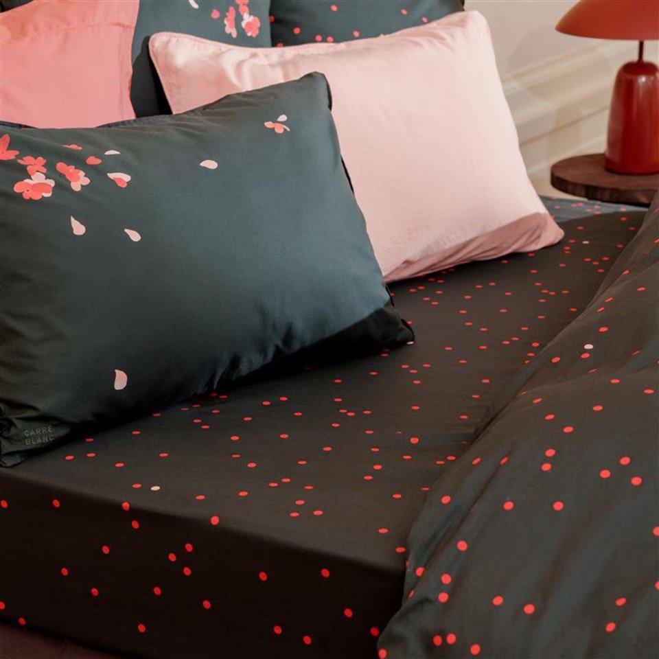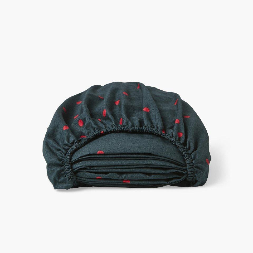 Простирадло на резинці IKEBANA поєднує в собі високу якість бавовни та стильний грайливий дизайн. Глибокий темно-зелений колір створює елегантний фон. Принт у вигляді контрастного візерунку у горошок. Основна маса горошин — яскраво-червоного, які хаотично розкидані по всій поверхні та додають принту динаміки та грайливості. Простирадло оснащене резинкою по всьому периметру, що забезпечує ідеальне прилягання до матраца та запобігає зісковзуванню. Має чітко окреслені кути для зручного одягання на матрац.