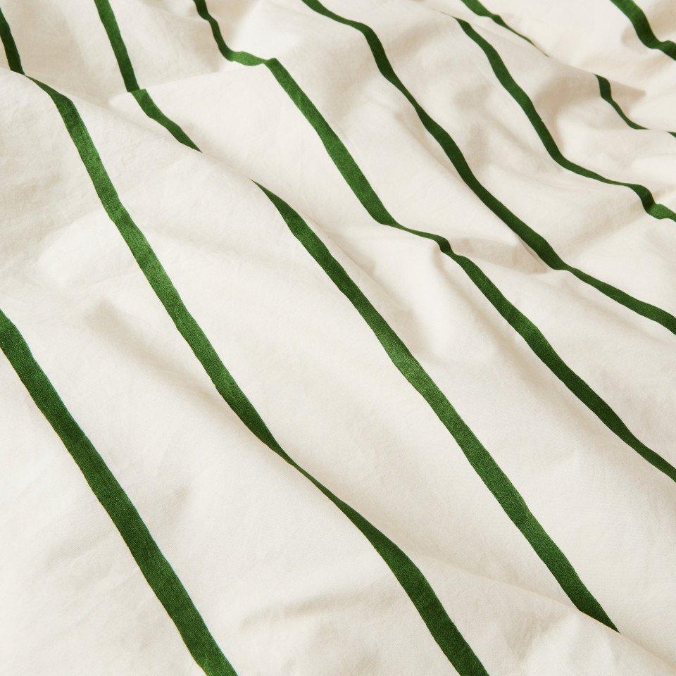 Світлий кремовий фон із чіткими вертикальними смугами. Смуги виконані у темно-зеленому кольорі, який гармонійно перегукується з кольором листя квіткового візерунка. Сучасний та динамічний стиль дозволяє швидко змінити акцент у спальні на більш стриманий.