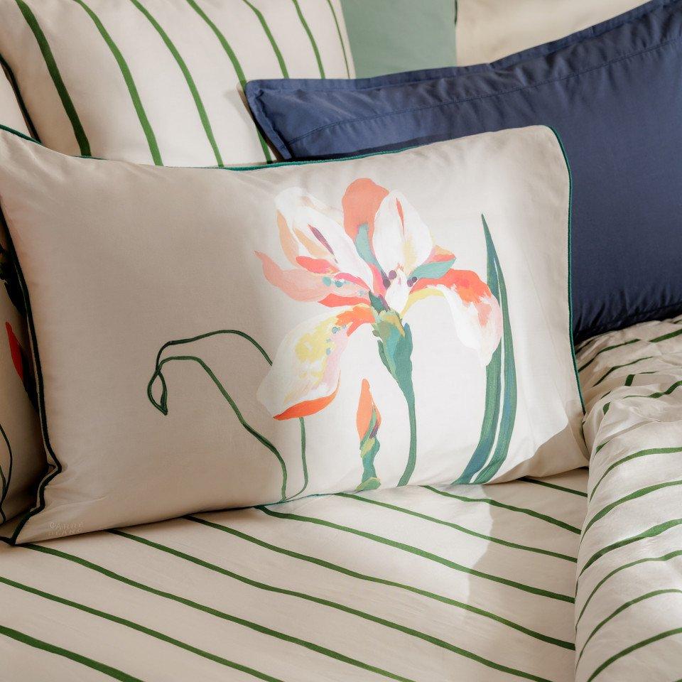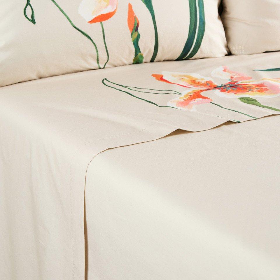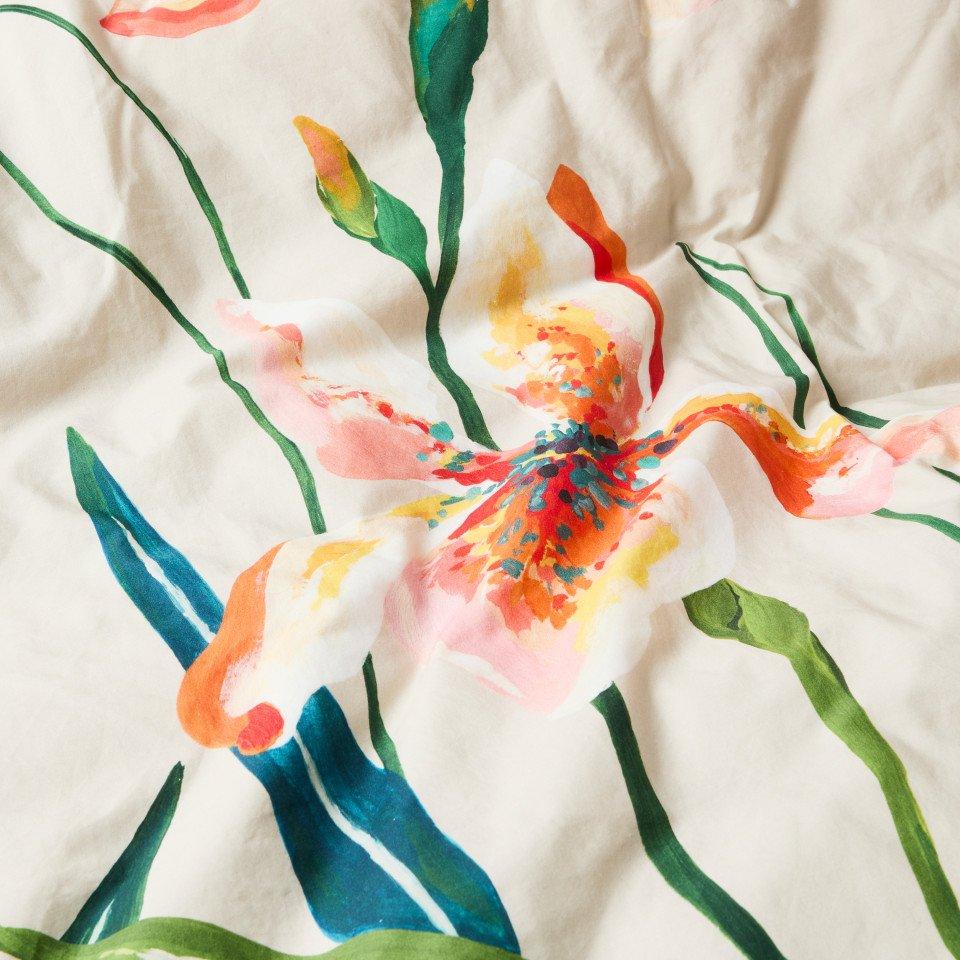 Простирадло LYSIRIS із принтом, що доповнює постільну білизну з квітковим візерунком *Ірис*. Воно виготовлене з бавовни та має підтвердження безпеки матеріалів OEKO-TEX® STANDARD 100.