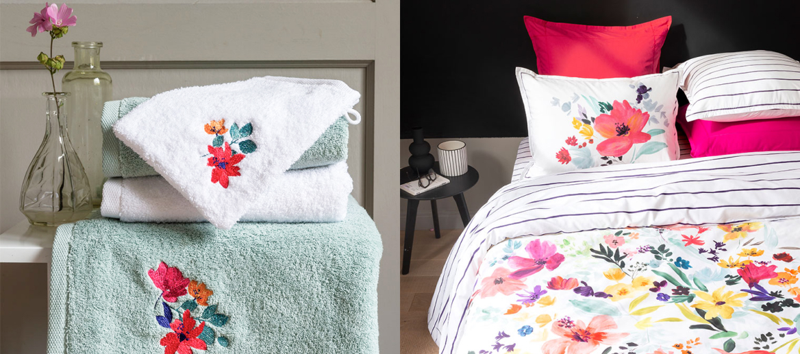 Пишні букети колекції ODE навіюють думки про класичний живопис, натюрморти та малюванні на пленері. Барвистий трендовий розмай відтінений смугами, які використовуються як альтернативний принтовий візерунок на іншому боці підковдри. Така прикраса постільного гарнітура з бавовняного перкалю дозволяє балансувати між яскравістю та стриманістю.